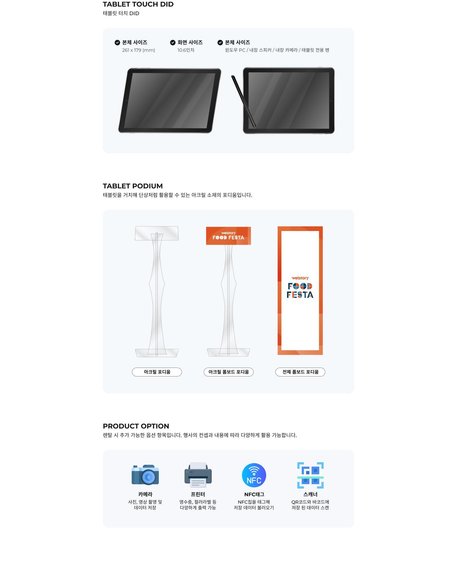 스탠드형과 태블릿형 두가지 형태로 사용 용도에 따라 선택하실 수 있습니다.